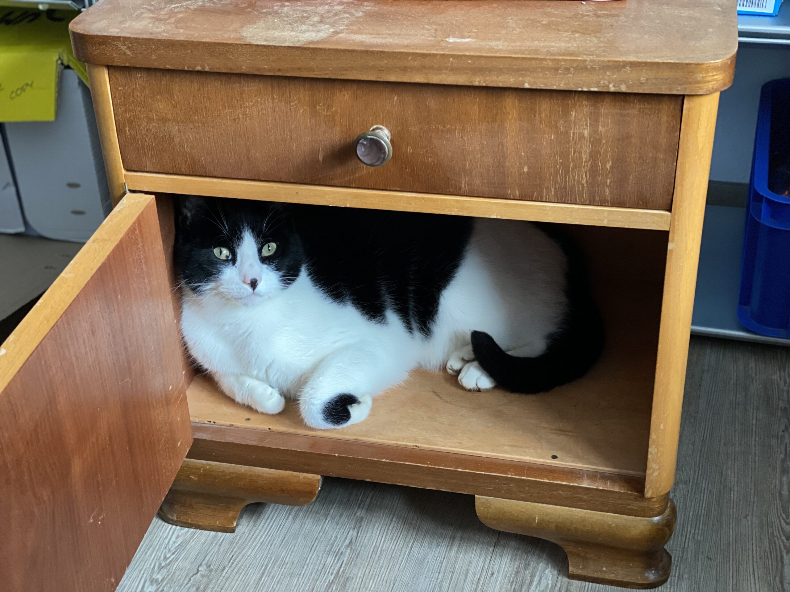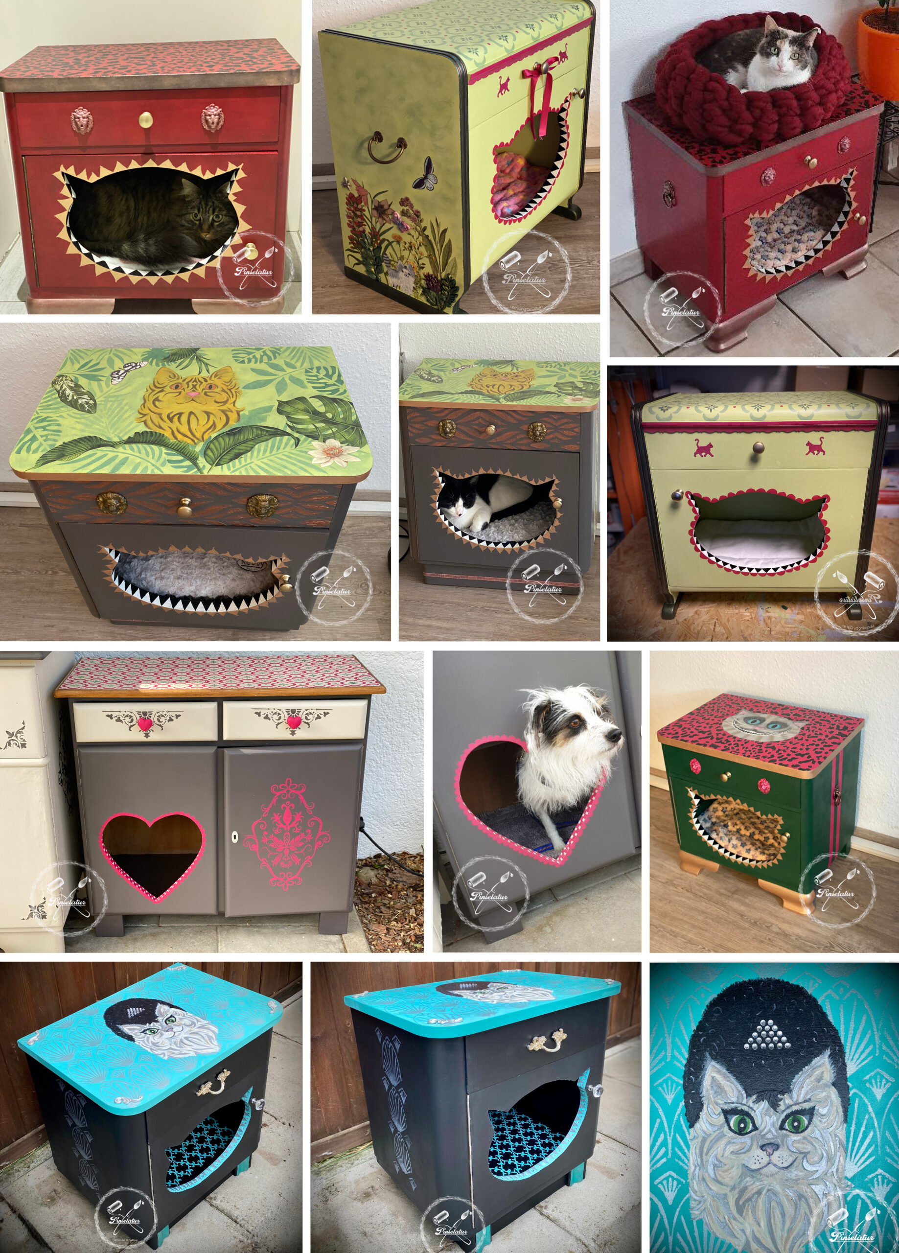 Diese, aus kleinen alten Schränkchen aufwendig umgestalteten Katzenhöhlen bieten einen gerne genutzten Rückzugsort für unsere Samtpfoten.