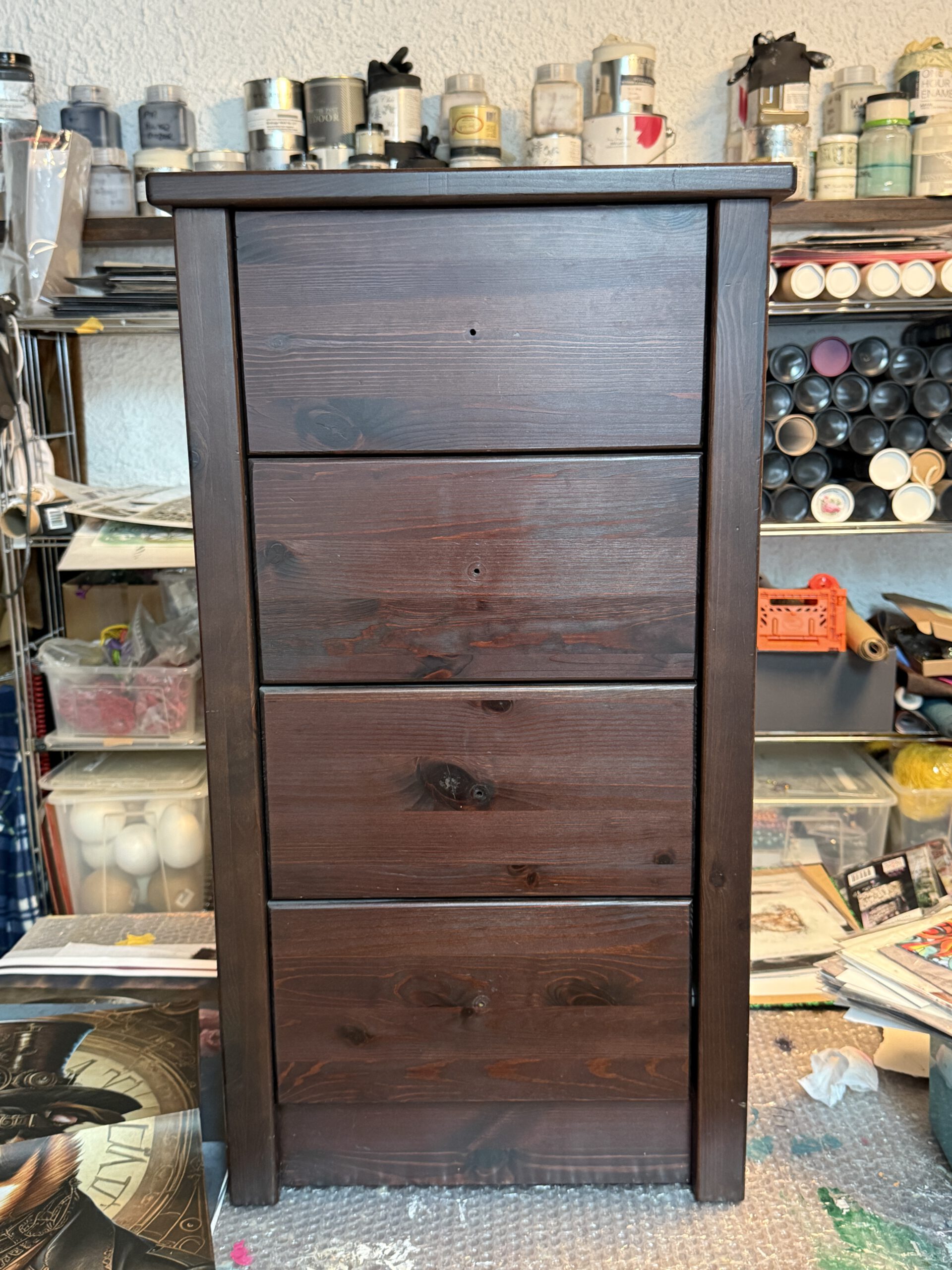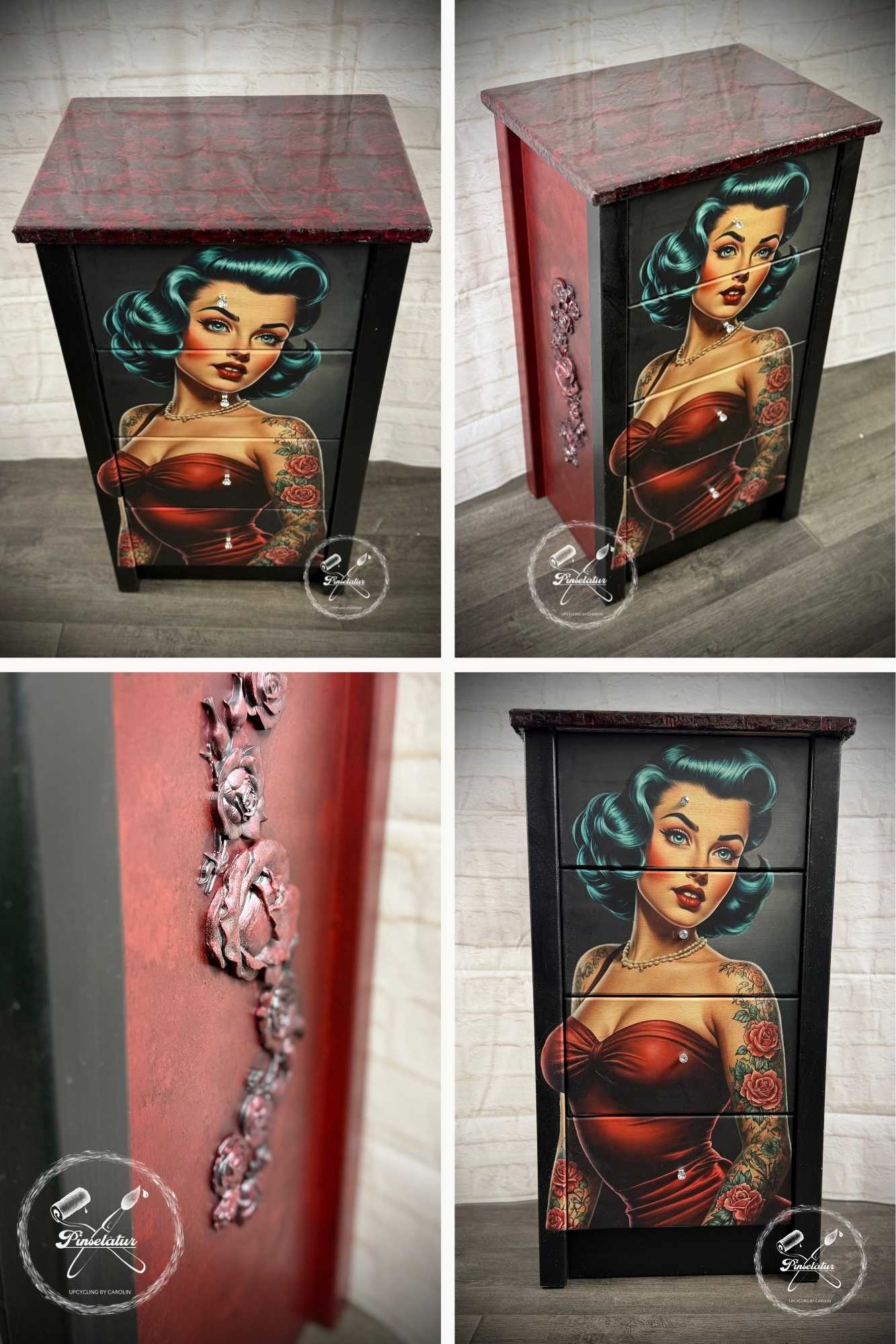 Aus einem langweiligen kleinen Schubladenschrank wurde ein Schubladenschrank mit einer Rockabilly Rosie als eine Hommage an eine tolle Ära, Deckplatte mit einem Rosendekor-Tuch passend zum Tatoo in Resin eingelassen, gehalten in weinrot und schwarz, an den Seiten ein Rosendekor.