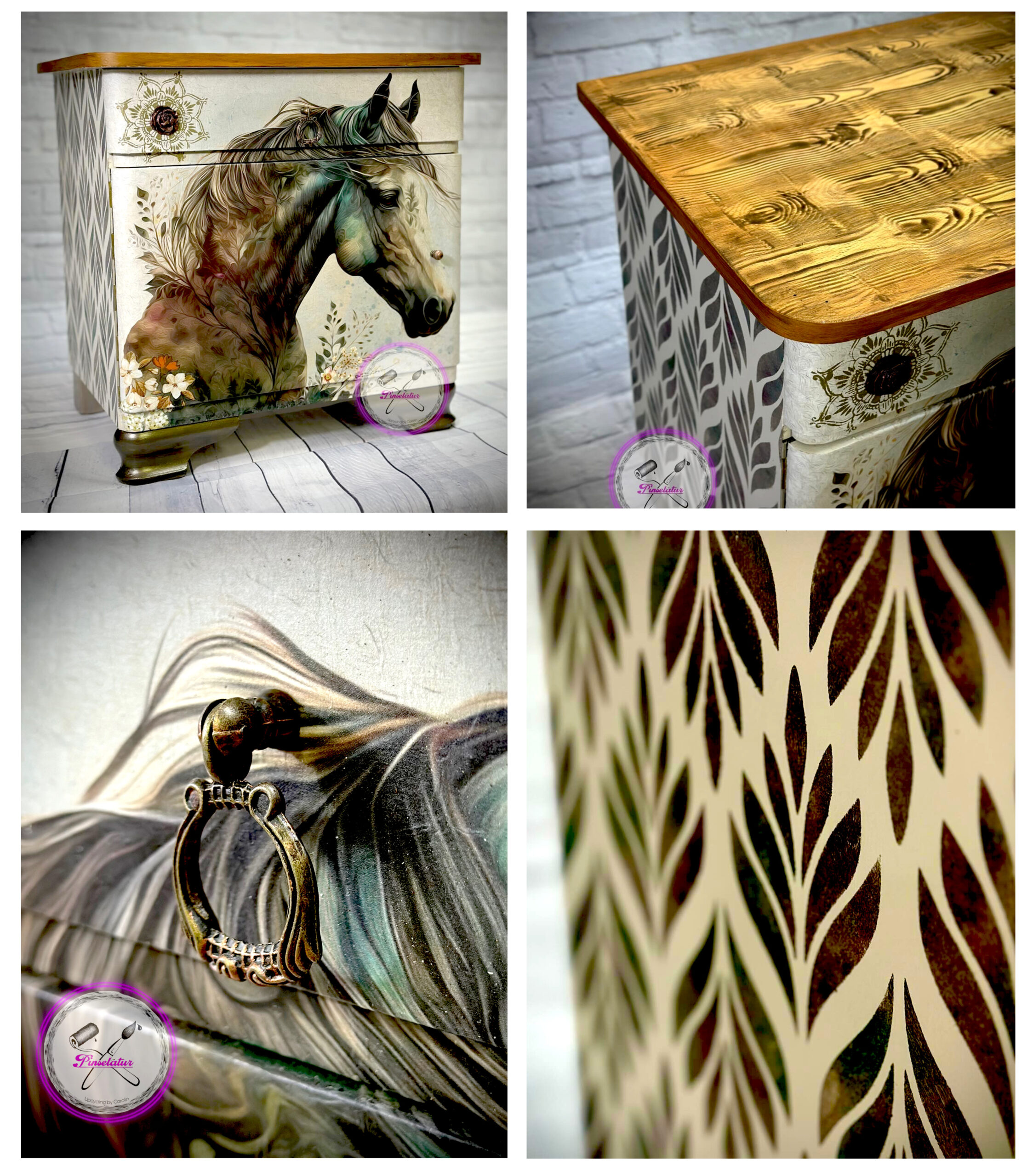 In schöner Pferde-Blumen-Optik ist es nun ein hübsches Deko-Objekt mit einer täuschend echt aussehenden, nachträglich erzeugten Holzmaserung auf der Oberseite.