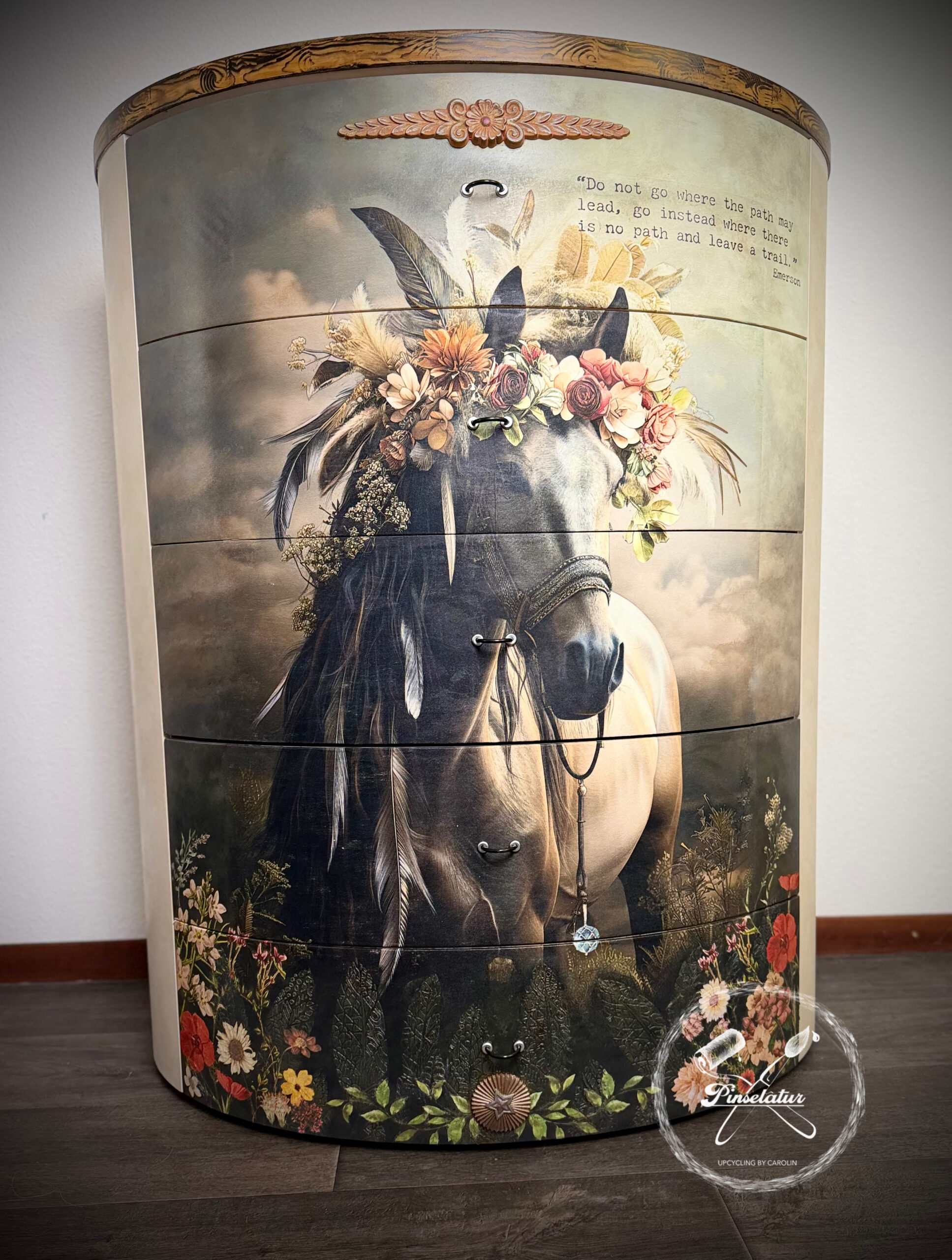 Diese große wertige 90er Jahre Schubladenkommode verwandelte sich in eine schöne Pferdekommode „LEAVE A TRAIL“