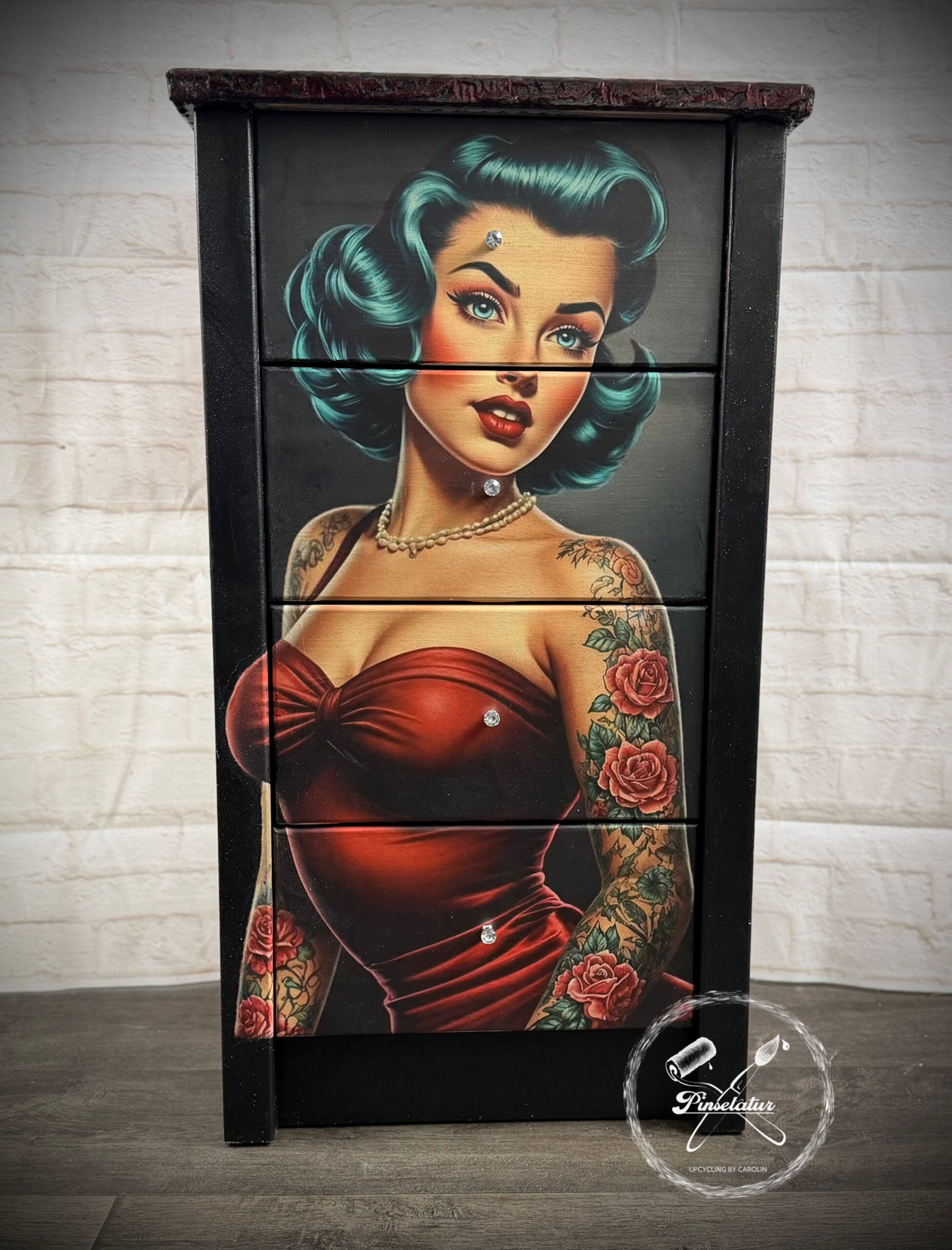 Dieser kleine langweilige Schubladenschrank verwandelte sich in ein sexy Nostalgieschränklein als Hommage an eine tolle Ära…